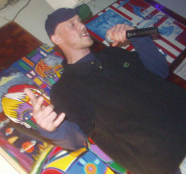 Rocky Aoki gets his sake bottle signed by Planas Planas also decorated a bamboo Sake set, Mr. Aoki who is to launch a book and a sake brand under his own famous Benihana trademark, is so in love Planas's bottles that he has offered Planas a way into the Japanese art market by commissioning Planas to create his original designs on the Sake bottles. As part of the introduction Planas will travel to Japan with Mr. Aoki to showcase his unique art form in Tokyo. Westbury, Long Island American Royal Arts is a company which distributed popular animation art from Disney, and Warner Bros. The CEO was enamored by Planas's colorful renditions of his animals on the bottles, he asked Planas to create a collection of the famous Warner Bros. characters, Bugs Bunny, Tasmanian devil, Tweety Bird and all the other characters in Planas's unique way. American Royal Arts is worldwide distributor of fine art prints which will also be handling the limited edition production of original Planas artworks! San Francisco, CA Jefferson Starship singer and song writer Marty Balin also well known for his paintings congratulates Planas on a job well done during the international San Francisco Art Expo Marty posed with a Planas bottle and became a Planas collector. MTV agrees to showcase the original paintings by Planas paintings at MTV headquarters in Times Square NYC. During the month of Sept 2002 through DEC 2002 MTV will show the Planas 'paintings trough their Eye Candy, program. Well it was a great time for Planas in NYC and he wants thank all his fans and friends for continuing to support and enlarge his artistic vision! Keep coming back to Planet Planas website for new stories and information on the summer of Love Planas art tour to begin in Philadelphia at the I. Brewster Gallery till then have safe and fabulous time! Jon